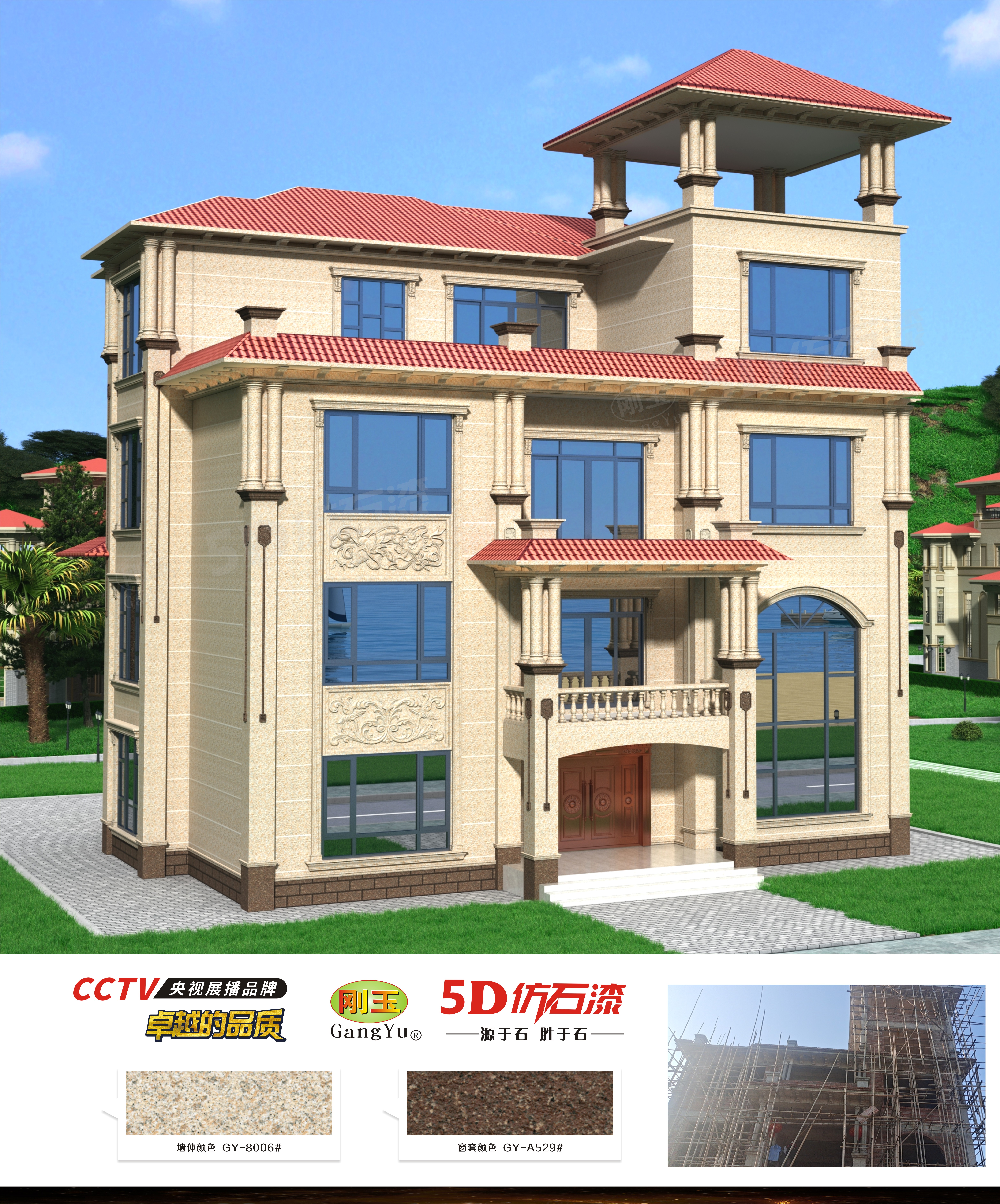 9.方便隨形。水包砂不僅可在圓柱,弧面等各種異型,特殊造型上隨意噴涂;還可用于水泥磚墻、泡沫、石膏、鋁板、玻璃等多種基面,且可隨建筑物的造型任意涂裝。